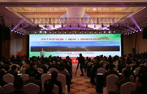 【宁化】 2月24日,宁化县委书记余建地带队赴福州开展招商活动。在福州市宁化商会第三届理(监)事会就职典礼暨宁化专场招商推介活动中,会议成功签约新型节能环保建筑材料生产项目、纸箱生产项目等15个工业、农业等领域的合作与意向项目,总投资额21.2亿元。福建省委统战部副部长、省工商联党组书记李家荣等领导以及各界乡贤代表共计600多位客商参加招商推介会。
