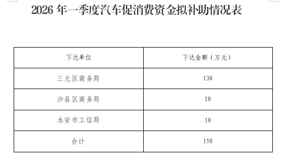 根据《福建省商务厅 福建省财政厅关于开展2026年一季度汽车促消费补贴活动的通知》(闽商务〔2026〕13号)文件精神,为进一步提振我市汽车消费市场活力,经三元区商务局、沙县区商务局、永安市工信局申请,并上报活动实施方案,市商务局党组会议研究通过,拟下达一季度汽车促消费资金150万元。现予以公示,如有异议,请于公示截止日期前向市商务局以书面形式反馈。