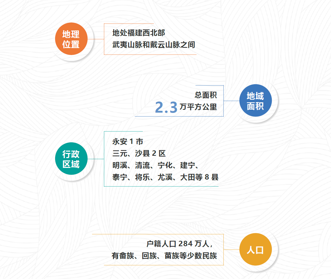 风展红旗,如画三明。三明地处福建西北部,总面积2.3万平方公里,辖11个县(市、区),户籍人口284万人,自然概貌为“八山一水一分田”,是闽人之源、闽学之源、闽师之源、闽江之源,“客家祖地”、万寿岩遗址、大金湖等闻名全国,拥有全国文明城市、国家卫生城市、全国双拥模范城、全国综治“长安杯”、平安中国建设示范市等荣誉。