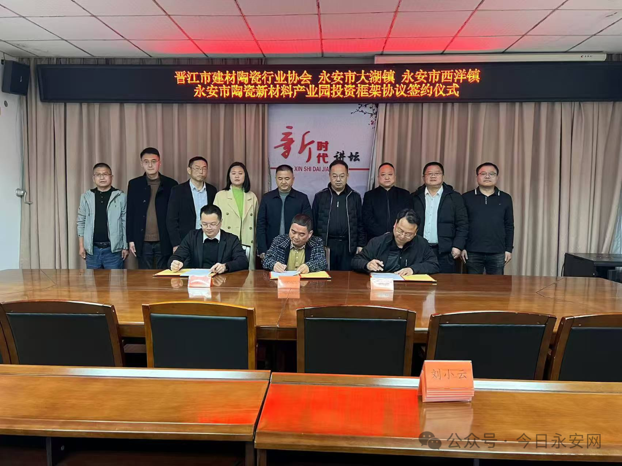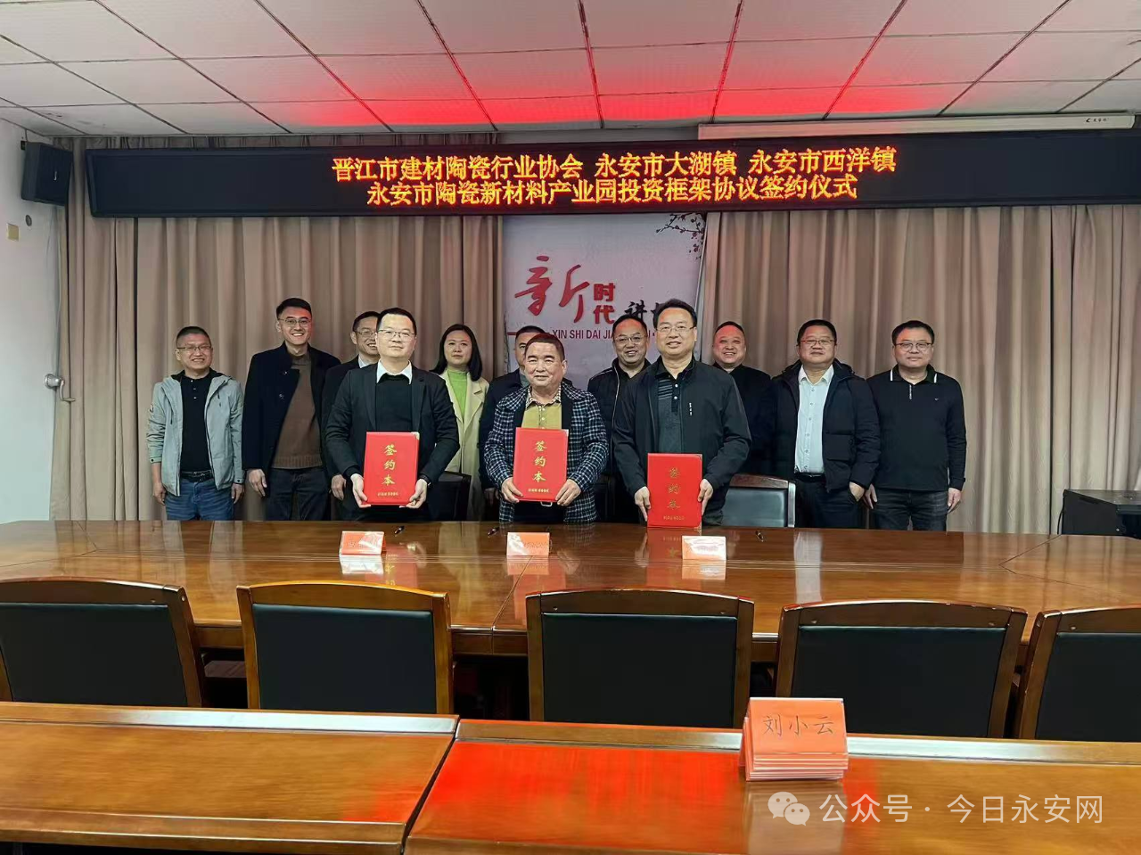 12月26日,在永安市发改局会议室,永安市西洋镇、大湖镇与晋江市建材陶瓷行业协会举行《永安市陶瓷新材料产业园投资框架协议》签约仪式。晋江市工信局、晋江市发改局和永安市发改局等单位有关领导共同参加了签约仪式。
