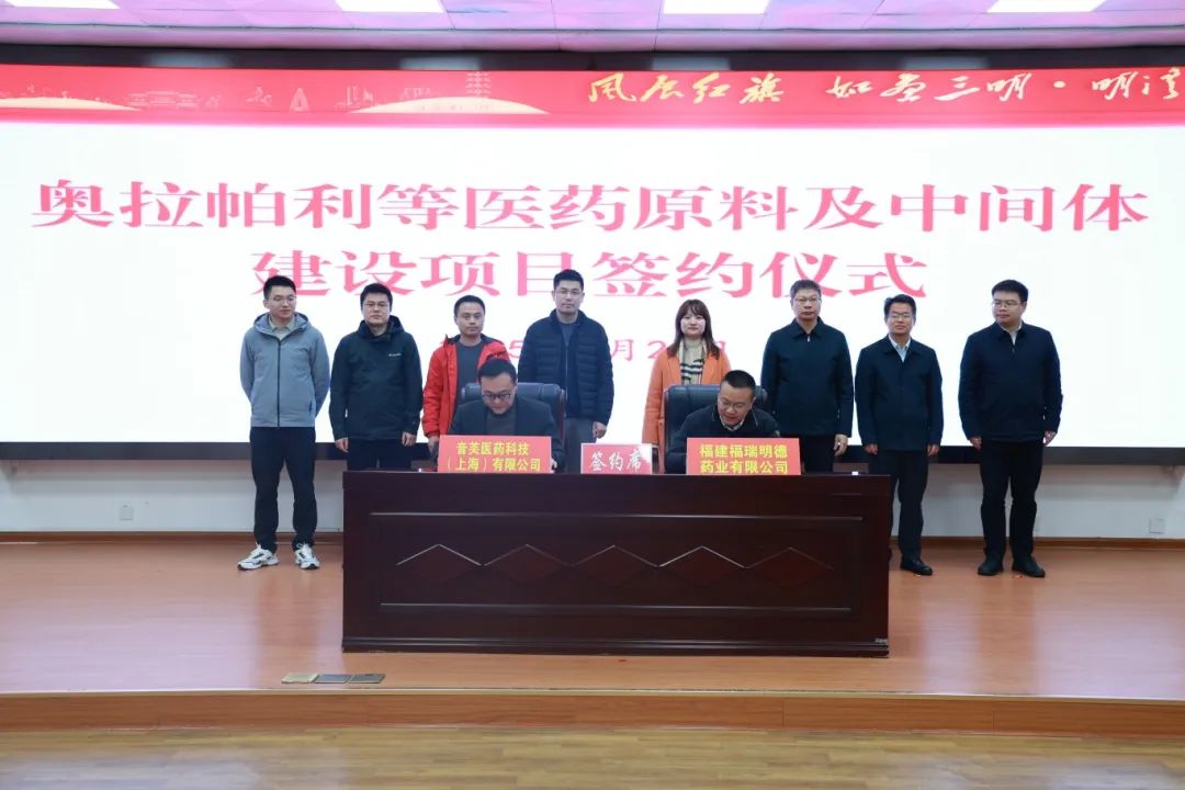 2月21日,明溪县举行奥拉帕利等医药原料及中间体建设项目签约仪式。音芙医药科技(上海)有限公司董事长沈强,福建福瑞明德药业有限公司董事长陈清林,县领导张文静、胡开钱、廖廷建、童良等出席签约仪式,音芙医药科技(上海)有限公司副总经理王晓军和福建福瑞明德药业有限公司总经理陈海松作为双方代表进行签约。